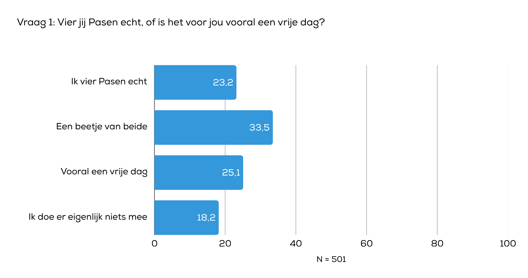 Een aanzienlijk deel van de respondenten viert Pasen daadwerkelijk: 23,2% geeft aan het feest echt te vieren. Daarnaast ziet 33,5% Pasen als een combinatie van vieren en het genieten van een vrije dag. Tegelijkertijd beschouwt 25,1% het vooral als een extra vrije dag, zonder veel nadruk op de viering zelf. Tot slot geeft 18,2% aan er eigenlijk niets mee te doen. Deze resultaten laten zien dat Pasen voor veel mensen minder een uitgesproken traditie is en vaker wordt ervaren als een moment van ontspanning, waarbij de invulling per persoon sterk verschilt.