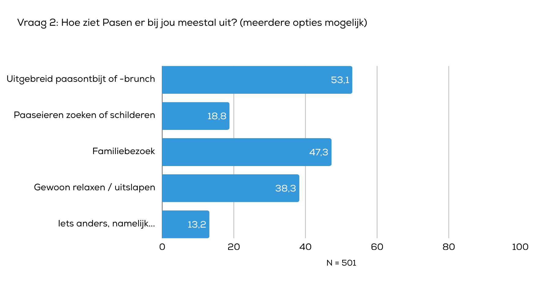 Pasen wordt door veel respondenten op verschillende manieren ingevuld, waarbij meerdere activiteiten vaak worden gecombineerd. Zo geeft 53,1% aan te genieten van een uitgebreid paasontbijt of brunch, terwijl 47,3% een familiebezoek plant tijdens Pasen. Daarnaast kiest 38,3% ervoor om vooral te ontspannen of uit te slapen. Meer traditionele activiteiten, zoals paaseieren zoeken of schilderen, worden door 18,8% genoemd. Tot slot geeft 13,2% aan Pasen op een andere manier te vieren. Deze resultaten laten zien dat Pasen voor veel mensen draait om gezellig samenzijn en ontspanning, met ruimte voor zowel traditie als eigen invulling.