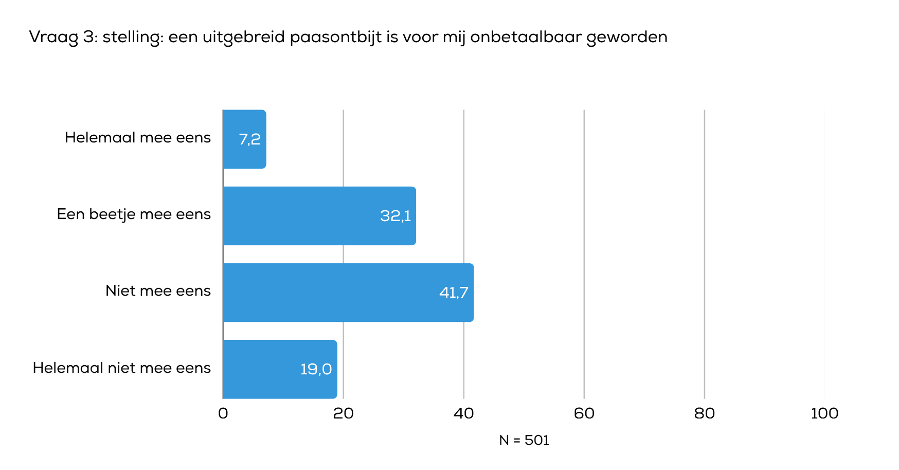 Een deel van de respondenten ervaart een uitgebreid paasontbijt als (deels) onbetaalbaar. Zo geeft 7,2% aan het hier helemaal mee eens te zijn en vindt 32,1% het een beetje onbetaalbaar geworden. Samen komt dit neer op 39,3% van de respondenten die de kosten als een probleem ervaart. Daartegenover staat dat 41,7% het niet eens is met de stelling en 19,0% het er helemaal niet mee eens is. Deze resultaten laten zien dat de meningen verdeeld zijn: een grote groep merkt prijsstijgingen op, maar een iets grotere groep vindt het paasontbijt nog steeds betaalbaar.