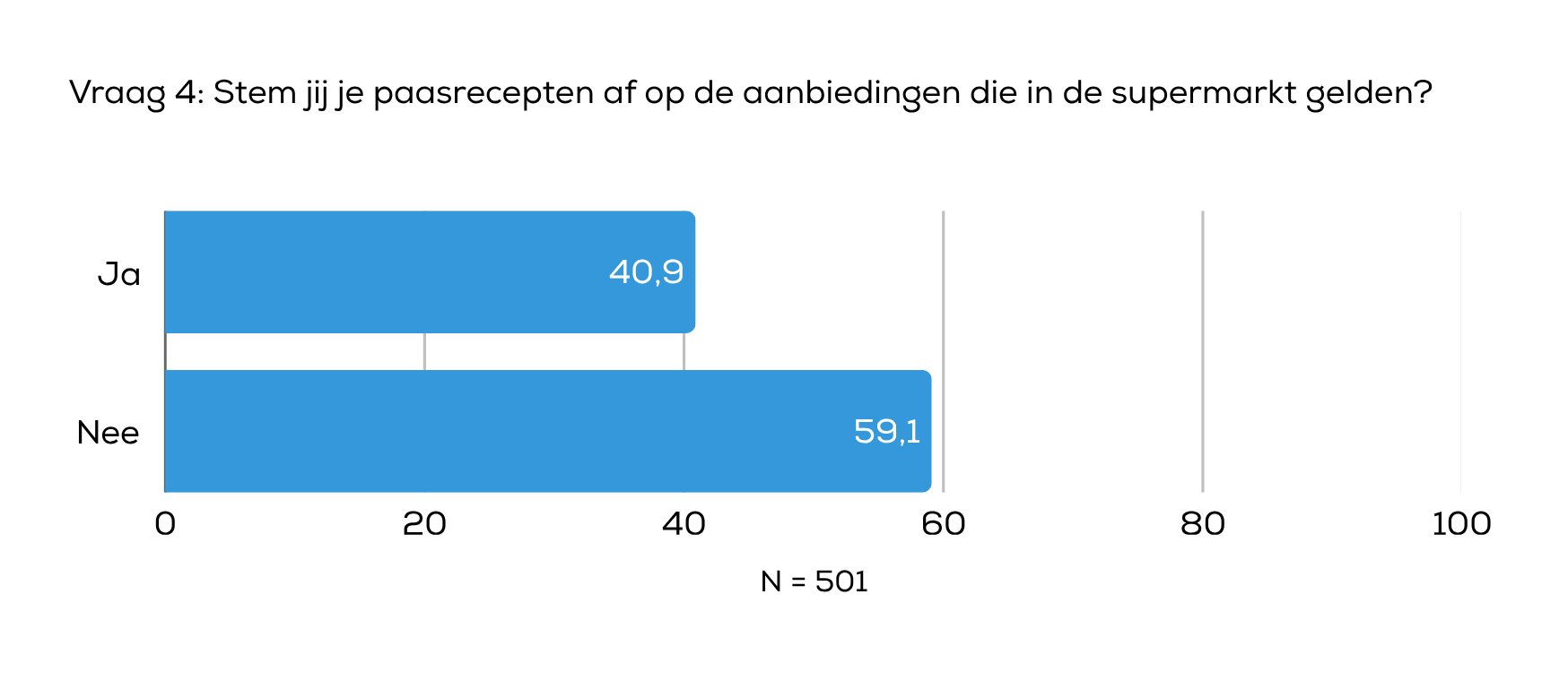 Een deel van de respondenten houdt bij het plannen van paasgerechten rekening met de aanbiedingen in de supermarkt: 40,9% stemt zijn recepten op de acties af. Daartegenover staat dat 59,1% dit niet doet. Dit laat zien dat voor een aanzienlijk deel van de mensen prijsvoordeel invloed heeft op de invulling van Pasen, terwijl de meerderheid vooral kiest wat zij zelf willen bereiden.