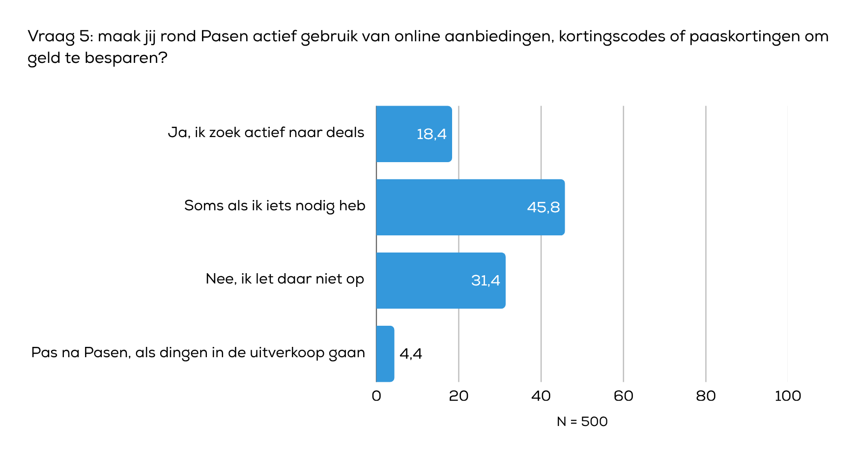 Een deel van de respondenten maakt actief gebruik van online aanbiedingen rond Pasen om geld te besparen. Zo zoekt 18,4% actief naar deals, terwijl 45,8% dit soms doet als ze iets nodig hebben. Daarnaast let 31,4% niet op kortingen en maakt 4,4% pas na Pasen gebruik van uitverkoopacties. Deze cijfers laten zien dat hoewel een aanzienlijk deel prijsbewust is tijdens Pasen, de meeste mensen dit vooral doen wanneer het hen uitkomt of niet actief volgen.